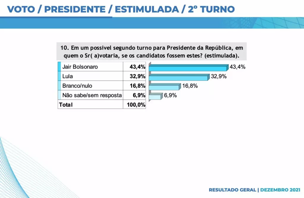No levantamento do segundo turno, o presidente Bolsonaro teria 43,4% contra 32,9% do petista Lula. Brancos e nulos são 16,8% e não sabe/indeciso, 6,9%.