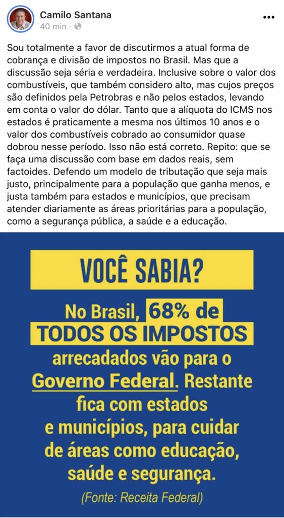 O governador do Ceará, Camilo Santana, falou sobre o desafio feito pelo presidente Bolsonaro de zerar o Imposto sobre Circulação de Mercadorias e Serviços – ICMS nos preços dos combustíveis.