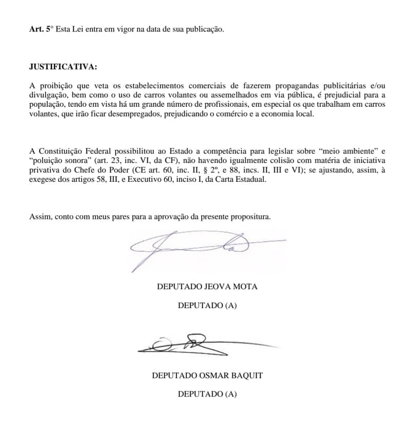 Os deputados Jeová Mota e Osmar Baquit, alegam na justificativa do projeto, que existe no Estado do Ceará, uma cultura de utilização dos carros de som na divulgação de produtos e serviços, sobretudo no interior do Estado, onde muitos pais de família sustentaram o lar através dessa atividade profissional.