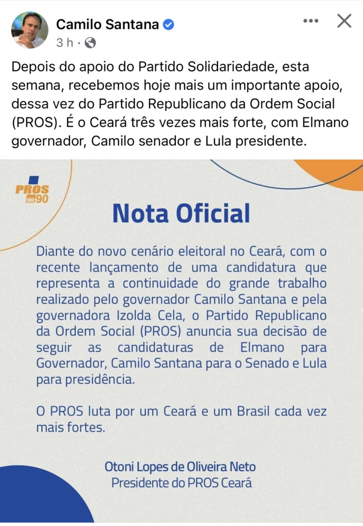 O ex-senador Eunício Oliveira aliado de Camilo e do PT no Ceará, até tentou tomar o PROS, mas não conseguiu e menos de 24 horas após o ex-governador ter anunciado apoio da sigla, o partido reparou o equívoco do Tribunal Superior Eleitoral (TSE), e retornou Adilson Pinho ao comando da referida agremiação partidária, no Ceará.