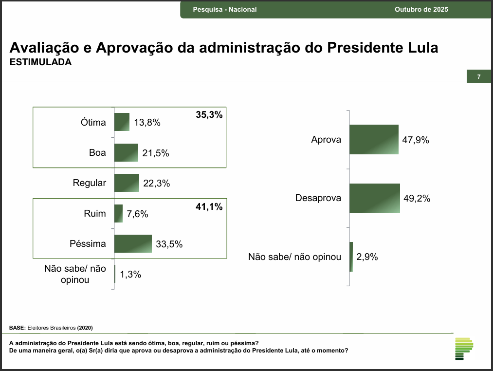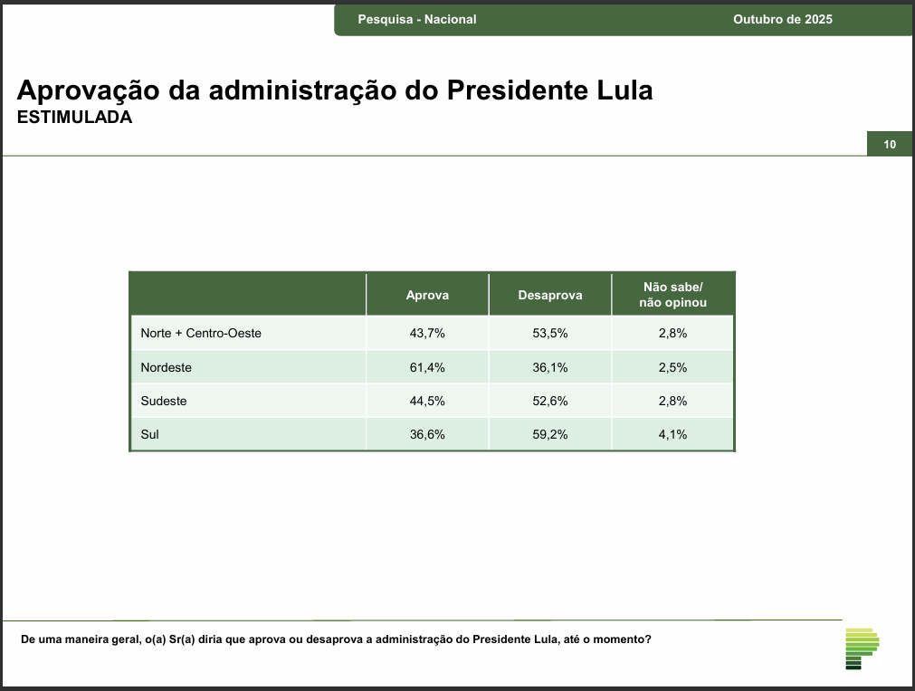 A reprovação do governo de Lula atinge 59,2% no Sul do Brasil, onde sua aprovação é de 36%. No outro extremo está o Nordeste, onde a administração do presidente petista bate 61,4% de aprovação, com reprovação de 36,1%.