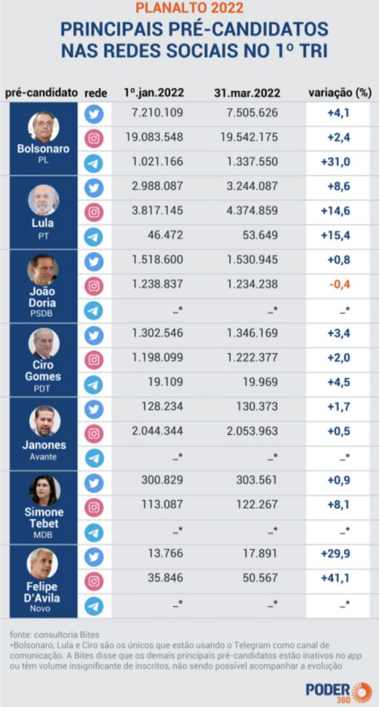 Faltando menos de 6 meses para as eleições de outubro, o presidente Jair Bolsonaro (PL) segue liderando com folga em número de seguidores nas redes sociais. Fechou o 1º trimestre de 2022 com 21 milhões a mais que o ex-presidente Luiz Inácio Lula da Silva (PT), considerando Twitter, Instagram e Telegram.