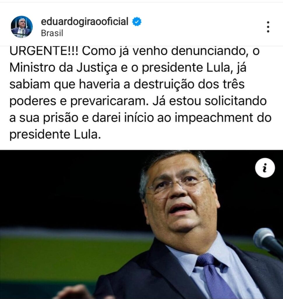 “Tenho conversado com o Senador Marcos do Val quase que diariamente desde o triste e reprovável tragédia do dia 01/08. O senador capixaba tem prestado um grande serviço a Nação pela sua coragem e ousadia buscando toda a Verdade sobre o emblemático episódio. Praticamente não nós desligamos nesse recesso. Diante das revelações acerca da confirmação de que o governo Lula sabia dois dias antes da gravidade dos atos violentos do dia 08/01 ,em Brasília , protocolei desde a semana passada na PGR- Procuradoria Geral da República, uma Representação criminal contra os Ministros do governo Lula e Flávio Dino (Justiça e Segurança pública) e o Gal. Marco Edson Gonçalves Dias (GSI) com forte argumentação baseada em fatos, fontes, dados e legislação contundentes que, ao nosso entendimento, demonstram que cometeram o crime da prevaricação, por omissão e inação, em suas competências legais. Eles tinham o dever de enfrentar, conjuntamente com o governo do DF, as ações hostis perpetradas por vândalos contra as sedes dos três Poderes da República pois sabiam dos objetivos das manifestações já que a própria ABIN alertou ao governo Lula que teriam a intenção de destruir fisicamente as instituições da República. Em situações como essa a nossa Constituição responsabiliza não apenas os mandantes e os executores mas também aqueles que podendo evitá-los se omitirem. Em nome da verdade essa investigação deve ser instaurada. Não podemos admitir seletividade na aplicação da Lei, principalmente quando há uma corresponsabilidade entre o Governo do DF e o executivo federal. O povo brasileiro não aceita dois pesos e duas medidas e merece resposta e punição justa. Para todos! Que a Verdade e a Justiça prevaleçam em nossa Nação. Jesus no comando”, escreveu o senador Eduardo Girão.