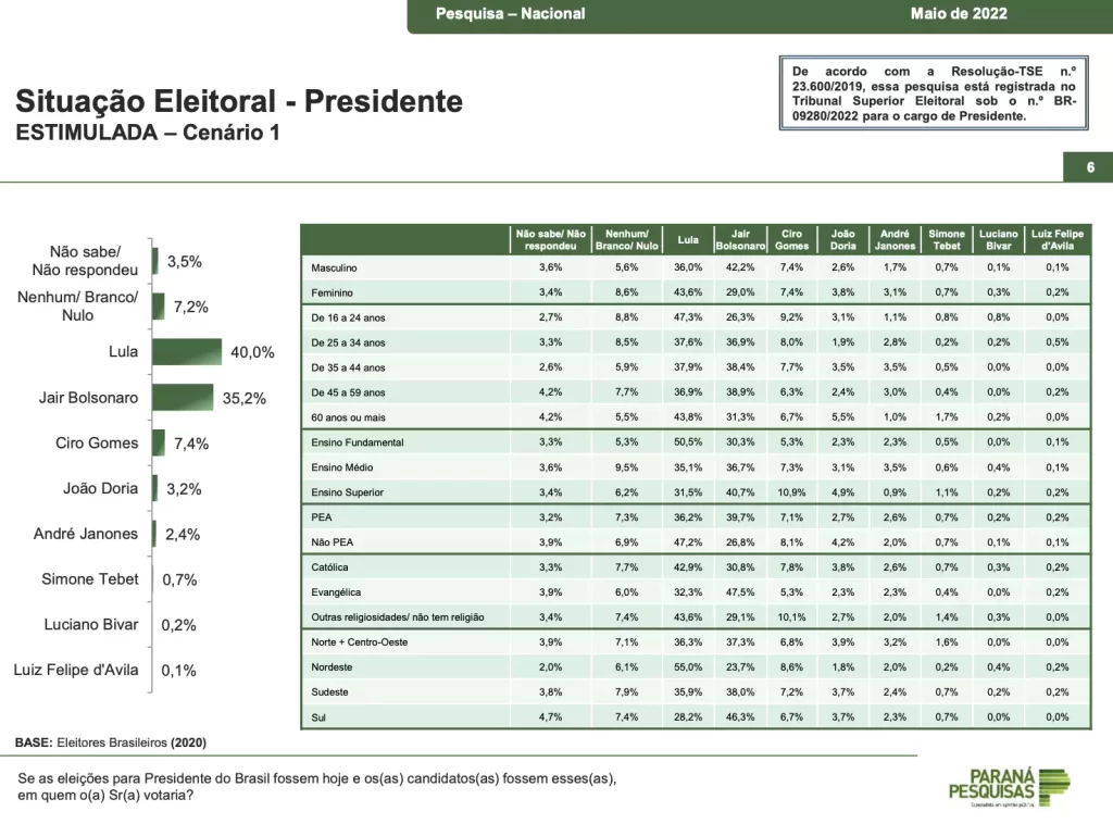 O levantamento nacional divulgado nesta quarta-feira (4) pelo Paraná Pesquisa sobre a disputa presidencial mostra que os dois principais pré-candidatos continuam a se aproximar: Lula (PT) teria 40% e o presidente Jair Bolsonaro (PL), 35,2%, se as eleições fossem realizadas hoje. No levantamento espontâneo, Lula tem 27,6% e Bolsonaro, 25,2%.