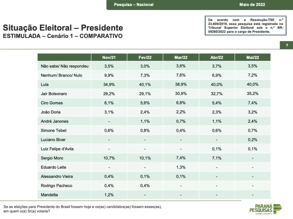 Desde fevereiro, Bolsonaro ganhou seis pontos no levantamento nacional Paraná Pesquisa, enquanto Lula continua nos mesmos 40%. É a menor distância entre os dois. O ex-juiz Sergio Moro, que voltou atrás da ideia de concorrer à presidência, já não aparece mais nos levantamentos. *DP