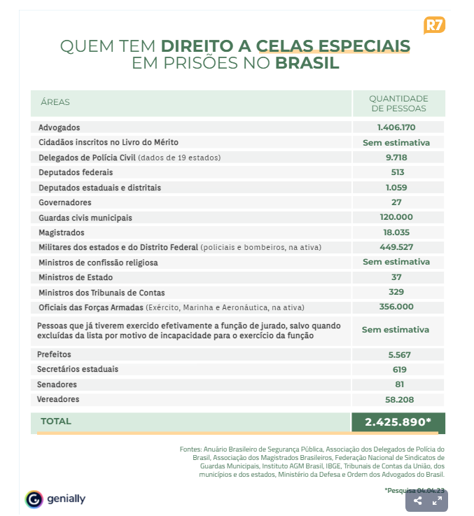 O Brasil tem cerca de 24.248.000 pessoas com curso superior, de acordo com o Instituto Brasileiro de Geografia e Estatística (IBGE). Os beneficiários da prisão especial representam 10% desse número. No universo da população brasileira, que tem 207.750.291 indivíduos, segundo a prévia do Censo 2022 divulgada em março, 1,2% mantêm a regalia.