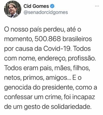 Outro que não perde a oportunidade de passar vergonha é o Senador Cid Gomes do PDT cearense, que ainda no domingo, foi a rede social tentar fortalecer a mentira sobre as mortes provocadas pelo vírus chinês.