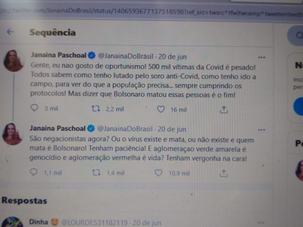 “Gente eu não gosto de oportunismo! 500 mil mortes é pesado! Todos sabem como tenho lutado pelo soro anti-covid, como tenho ido a campo, para ver do que a população precisa…sempre cumprindo os protocolos! Mas dizer que Bolsonaro matou essas pessoas é o fim!” Publicou Janaína.