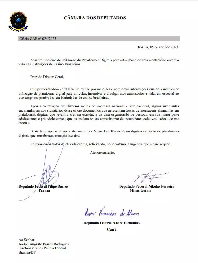 O deputado federal Nikolas Ferreira (PL-MG) informou, nesta quarta-feira (5), ao Diretor-Geral da PF, delegado Andrei Augusto Passos Rodrigues, que existem indícios de que jovens estão tramando e estimulando assassinatos coletivos em escolas brasileiras.