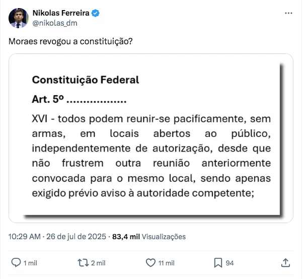 Neste sábado (26), o deputado federal Nikolas Ferreira (PL-MG) usou as redes sociais para questionar se o ministro do Supremo Tribunal Federal (STF), Alexandre de Moraes, revogou a Constituição.