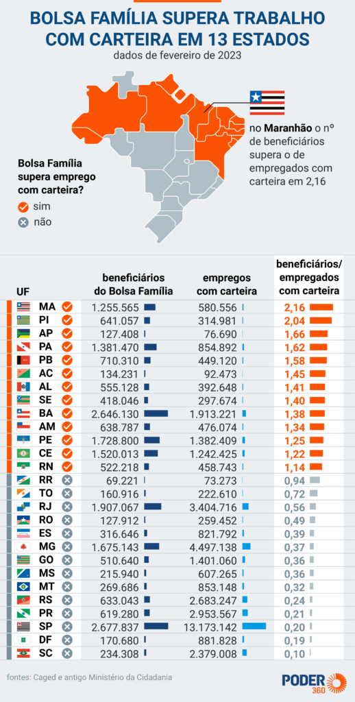 O número de beneficiários do Bolsa Família agora é maior que o de empregos com carteira assinada (o que exclui o setor público) em 13 das 27 Unidades da Federação. Ano passado, superava em 12.