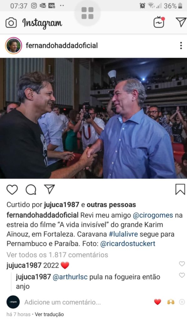 Haddad usou suas redes sociais para mostrar sua felicidade de reencontrar Ciro. “Revi meu amigo Ciro Gomes na estreia do Filme “A vida Invisível” do grande Karim Ainouz”, postou o ex-prefeito.