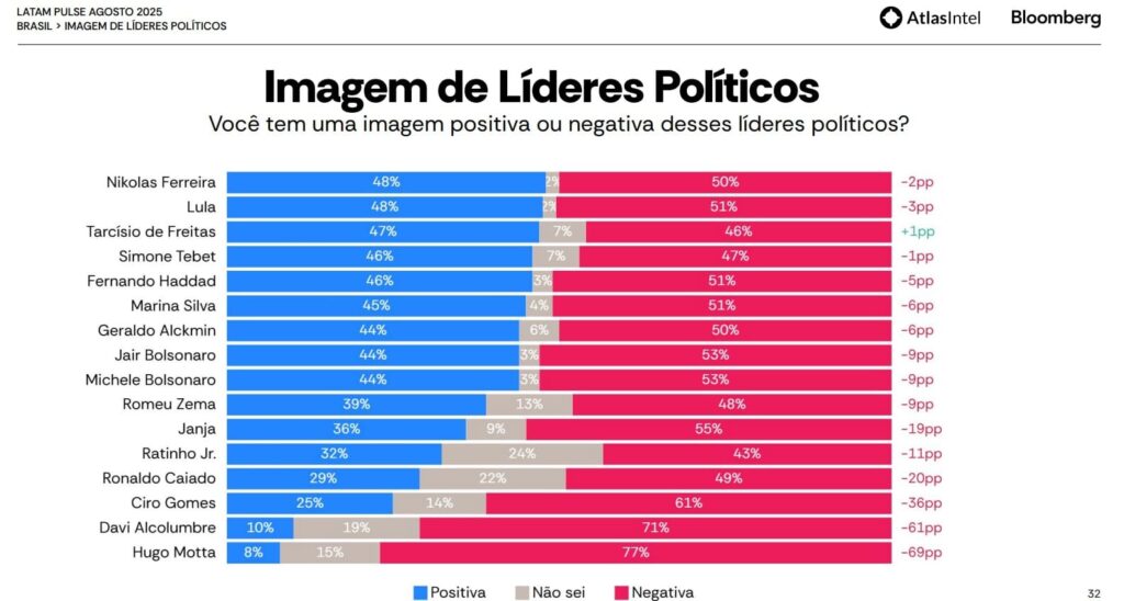 Pesquisa AtlasIntel/Bloomberg, divulgada nesta quinta-feira (28), mostra que o presidente da Câmara, Hugo Motta (Rep-PB) e o presidente do Senado, Davi Alcolumbre (União-AP), são os políticos com a pior imagem negativa do Brasil.