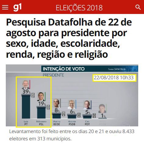 Neste mesmo dia 22 de agosto, sendo que em 2018, o cenário em que a pesquisa Datafolha colocava o presidente Jair Bolsonaro (PL) na disputa para o cargo executivo que ocupa hoje.