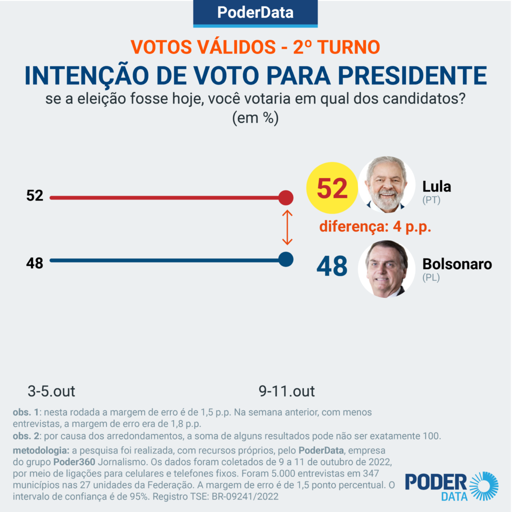 Pesquisa PoderData realizada de 9 a 11 de outubro de 2022 mostra Luiz Inácio Lula da Silva (PT) com 52% das intenções de votos válidos contra 48% de Jair Bolsonaro (PL) na corrida de 2º turno pela Presidência da República. As taxas consideram os votos válidos – os dados a algum candidato, excluindo-se brancos e nulos. É assim que o TSE (Tribunal Superior Eleitoral) divulgará os resultados na noite do domingo eleitoral de 2º turno, em 30 de outubro.