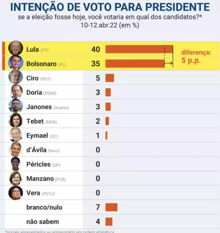 Levantamento do PoderData realizado entre os dias 10 e 12 de abril mostrou nova diminuição da distância entre o líder das intenções de voto, Lula, e o presidente Jair Bolsonaro, que agora têm 40% e 35%, respectivamente, das intenções de voto.