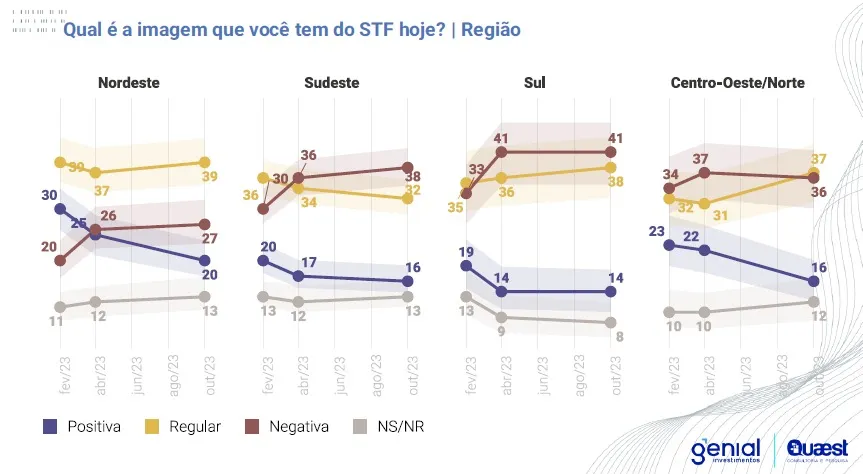 A região do país com melhor avaliação do tribunal é o Nordeste. Lá a Corte tem 20% de popularidade e 27% de rejeição.