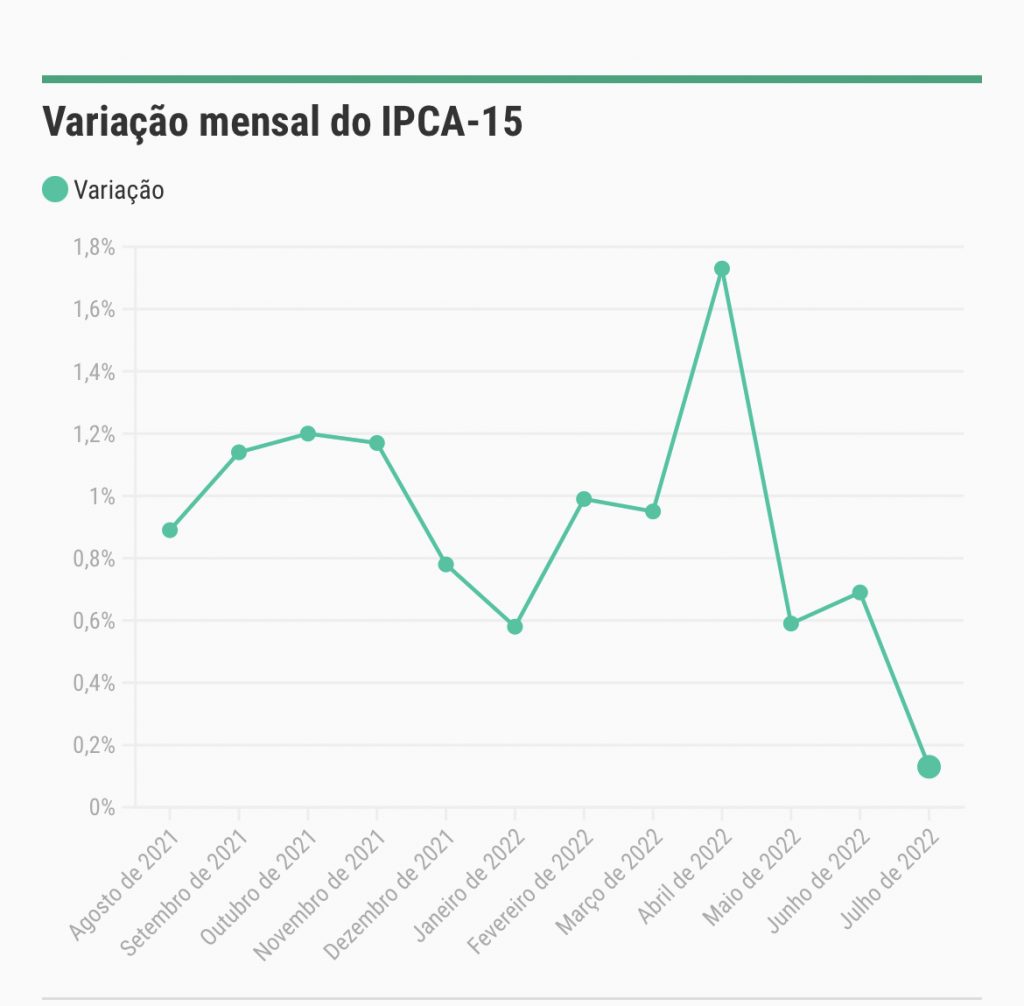 Considerado uma “prévia da inflação oficial”, o IPCA-15 desacelerou para 0,13% em julho na comparação com o mês de junho. Trata-se da menor variação mensal desde junho de 2020.