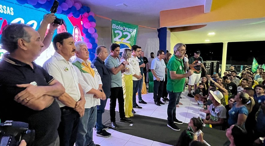 Integrantes do (PL), Dr. Acilon Gonçalves, prefeito do Eusébio na Região Metropolitana de Fortaleza, Dra. Mayra Pinheiro; senadores eleitos Rogério Marinho e Marcos Pontes, Deputado estadual Carmelo Neto (PL) e o Deputado Federal Júnior Mano (PL), falaram para uma plateia onde o verde e amarelo eram as cores predominantes.